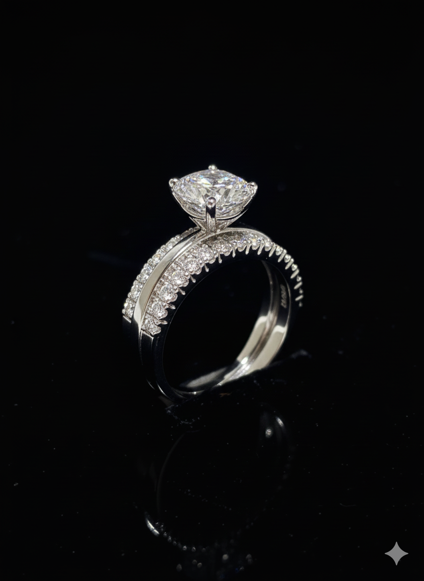 At its center, a striking solitaire rises elegantly, capturing light from every angle. It is complemented by two intricately detailed bands — adorned with delicate pavé accents — that frame the centerpiece in perfect harmony. Worn together, the trio creates depth, dimension, and an unforgettable glow.